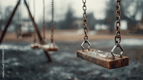 A weathered swing set in a deserted playground.
