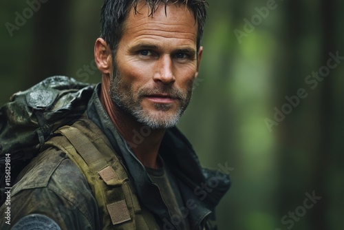 A weathered traveler stands alert with a backpack in a lush green forest, encapsulating a sense of exploration and rugged endurance amidst dense foliage and tranquility.