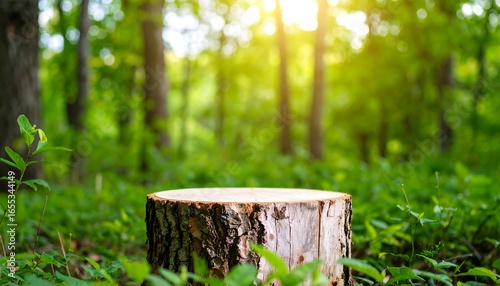A weathered tree stump sits amidst vibrant green foliage in a sunlit forest.