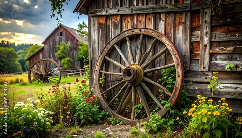 A weathered wagon wheel rests against a rustic wooden barn in a picturesque countryside scene, bathed in the warm glow of the setting sun.