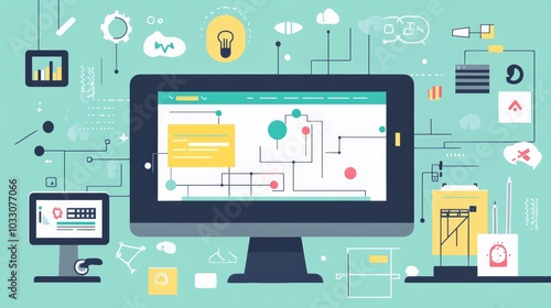 A website wireframe with UX design trends displayed on a large monitor, surrounded by creative tools and digital design elements