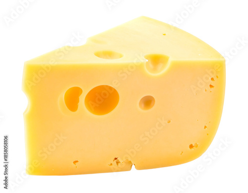 A wedge of Swiss cheese with characteristic holes isolated on a white background.