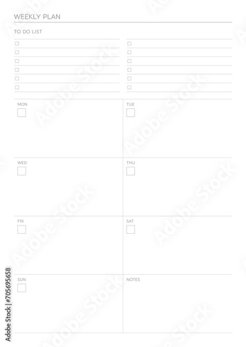 A weekly plan design template in a modern, simple, and minimalist style. Note, scheduler, diary, calendar, planner document template illustration.