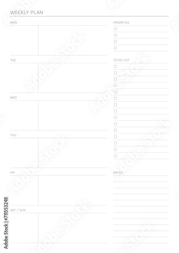 A weekly plan design template in a modern, simple, and minimalist style. Note, scheduler, diary, calendar, planner document template illustration.