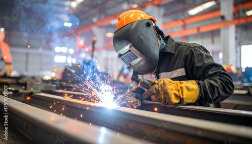 A welder, in a safety helmet and mask, works on metal with sparks flying in a factory. The scene is industrial and focused