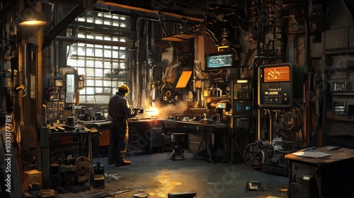 A welder operating a welding torch, surrounded by welding tools and heavy-duty metalworking equipment in a dimly lit workshop