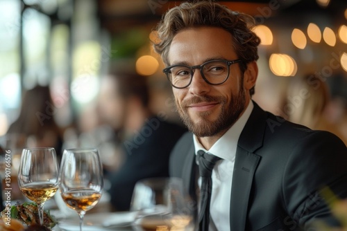 A well-dressed man enjoys his lunch in a stylish restaurant, surrounded by the ambiance of laughter, conversation, and exquisite cuisine Generative AI
