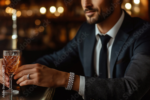 A well-dressed man holding a cocktail at a bar, showing off a sleek platinum bracelet, contemporary and chic vibe.