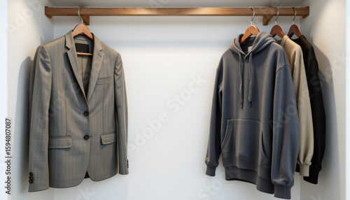 A well-organized clothing rack showcases a blazer and hoodies, reflecting a blend of formal and casual wear for modern living.