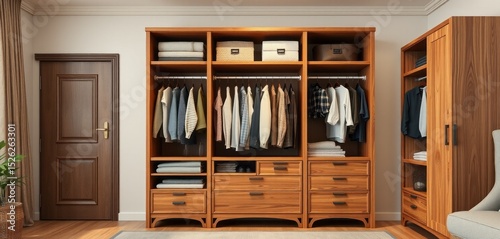 A well-organized, wooden closet showcasing clothes and storage boxes inside a neutral room setting.