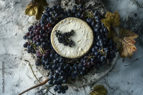 A wheel of creamy cheese adorned with dark grapes and autumn leaves, creating a rustic, elegant still life.