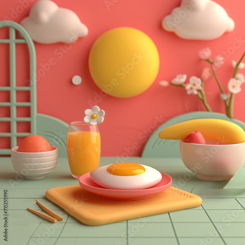 A whimsical 3D breakfast setup with egg, juice, and a sunny backdrop