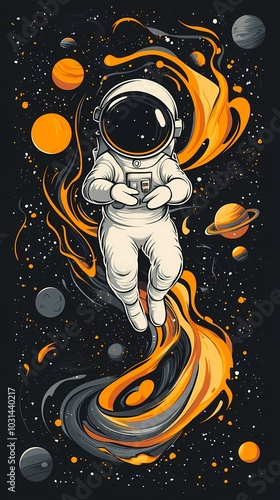 A whimsical astronaut floats through colorful space elements.