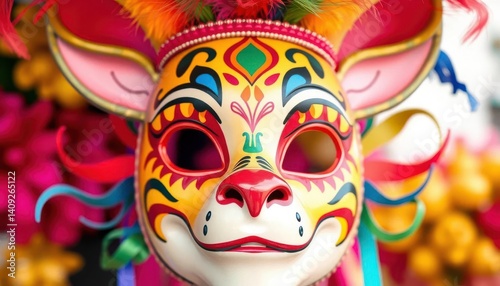 A whimsical carnival mask, featuring a vibrant, stylized animal face, vintage, celebratory