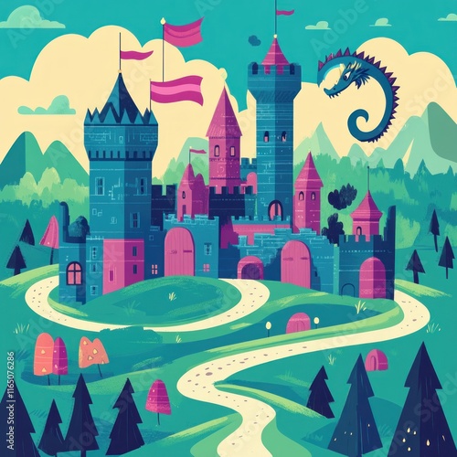 A whimsical castle scene with a dragon and rolling hills.