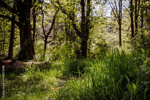 A whimsical corner of Lincoln Park in Seattle with tall grass, fallen trees and shade with sunlight beaming through. A lovely background.