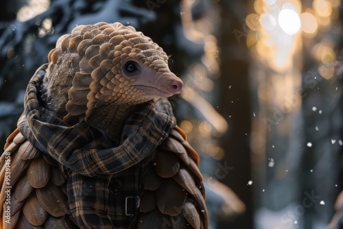 A whimsical creature, blending features of a pangolin and human fashion, stands in a snowy forest, showcasing winter style.