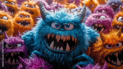 A whimsical digital illustration of a crowd of cute and fluffy monsters with horns and big teeth, showcasing vibrant colors and playful expressions.