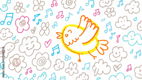 A whimsical drawing of a yellow bird flying amidst flowers clouds and music notes on a white background
