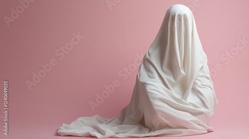 A whimsical ghost draped in a white sheet poses against a soft pink backdrop, creating a playful and mysterious atmosphere with a hint of humor.