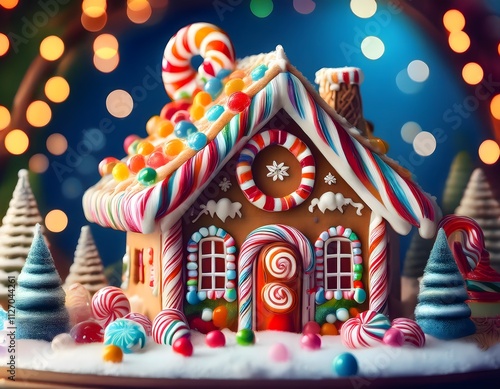 A whimsical gingerbread house decorated with candy canes, gumdrops, and icing, surrounded by snow and small Christmas trees