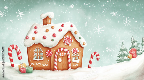 A whimsical gingerbread house with candy decorations in a snowy landscape and holiday atmosphere