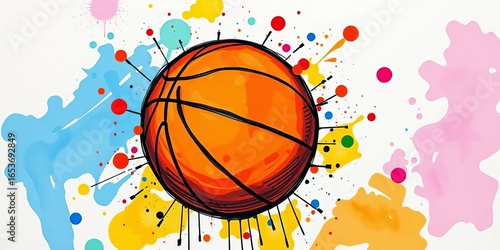 A whimsical, hand-drawn sketch of a basketball with splattered paint, vibrant, graphic design