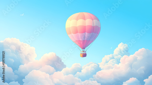 A whimsical hot air balloon in pastel colors floating among fluffy clouds in the sky. Pastel Balloon Skies. Illustration