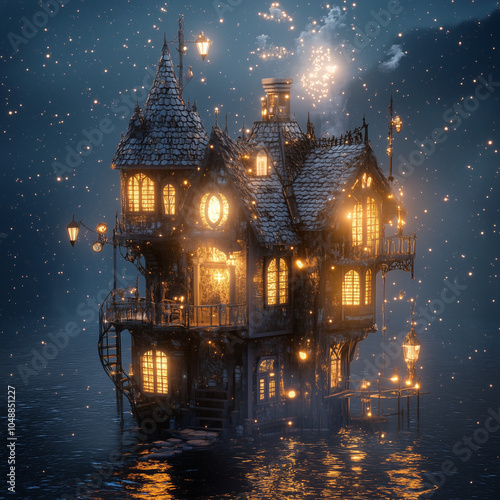 A whimsical house, floating in the middle of an ocean, covered in snow with lights glowing from within.