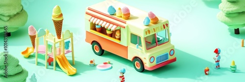 A whimsical ice cream truck scene with a playground and colorful ice cream cones.