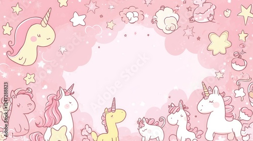 A whimsical illustration featuring unicorns and clouds on a pink background, ideal for invitations.