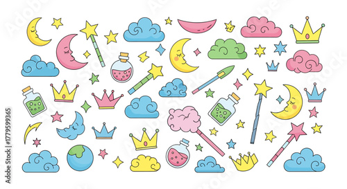 A whimsical illustration featuring various magical elements, including moons, stars, clouds, crowns, and potions.