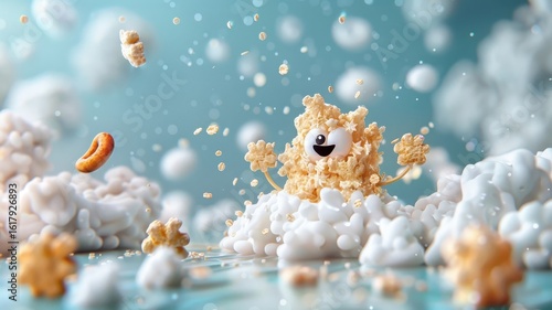 A whimsical illustration of a cornflake character exploring a fantastical world.
