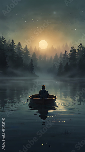 A whimsical illustration of a person in a small boat, drifting peacefully through a foggy lake, the mist surrounding them symbolizing confusion and uncertainty, with a faint glow of light ahead guidin