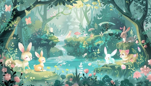 A whimsical illustration of pastelcolored animals frolicking in a dreamy, magical forest