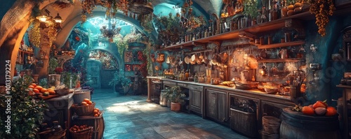 A whimsical kitchen filled with floating spices, vibrant ingredients, and fantasy creatures cooking surreal dishes, magical atmosphere, enchanting colors