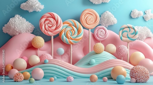 A whimsical landscape of colorful lollipops and candy spheres set against a bright blue sky with fluffy clouds