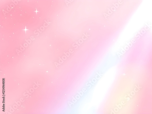 A whimsical pastel rainbow background shines with sparkling stars against a soft, pink fantasy sky. Fairy iridescent gradient backdrop.