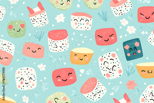A whimsical pattern featuring cute, smiling sushi and colorful food items on a light blue background.