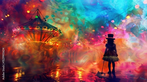 A whimsical scene of a little girl dressed as a circus performer, complete with a top hat and cane, standing in front of a vibrant circus tent. The colors are bright and saturated