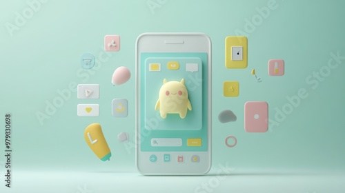 A whimsical smartphone design featuring a cute character and various colorful icons.