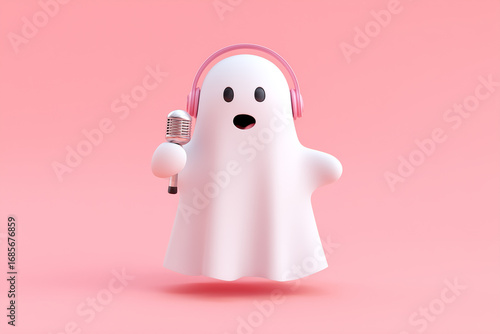 A whimsical spectral figure, donned with headphones and clutching a microphone, serenades against a soft, inviting pastel backdrop. A fun image of a singing ghost.