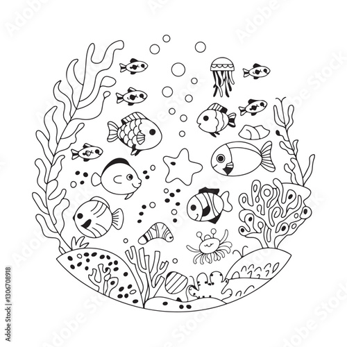 A whimsical underwater scene with cartoon fish and sea creatures in a black-and-white line art coloring book style