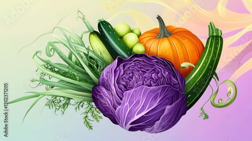 A whimsical vector illustration featuring a bundle of vegetables, including a purple cabbage, a bright orange pumpkin, a green zucchini, and a bunch of scallions.