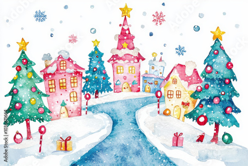 A whimsical winter scene featuring colorful houses, decorated trees, and a snowy pathway, evoking a festive holiday atmosphere.