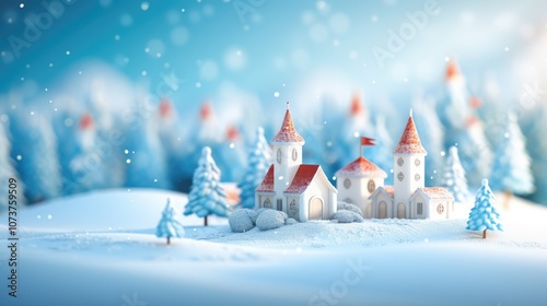 A whimsical winter scene showcasing a snowy village with charming houses and pine trees, evoking a magical holiday atmosphere.