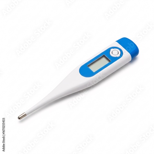 A white and blue digital thermometer with a blank screen, used for measuring body temperature,