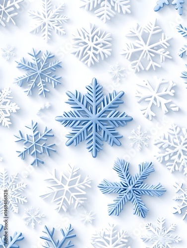 A white background with scattered white snowflakes and two larger blue snowflakes