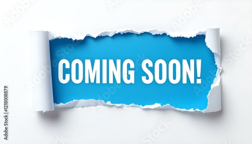 A white background with torn paper revealing bright blue underneath, displaying bold white text reading ‘COMING SOON!