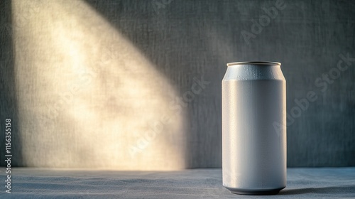 A white beverage can with a matte finish, photographed on a flat gray surface with a subtle light gradient in the background